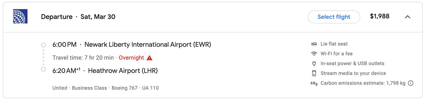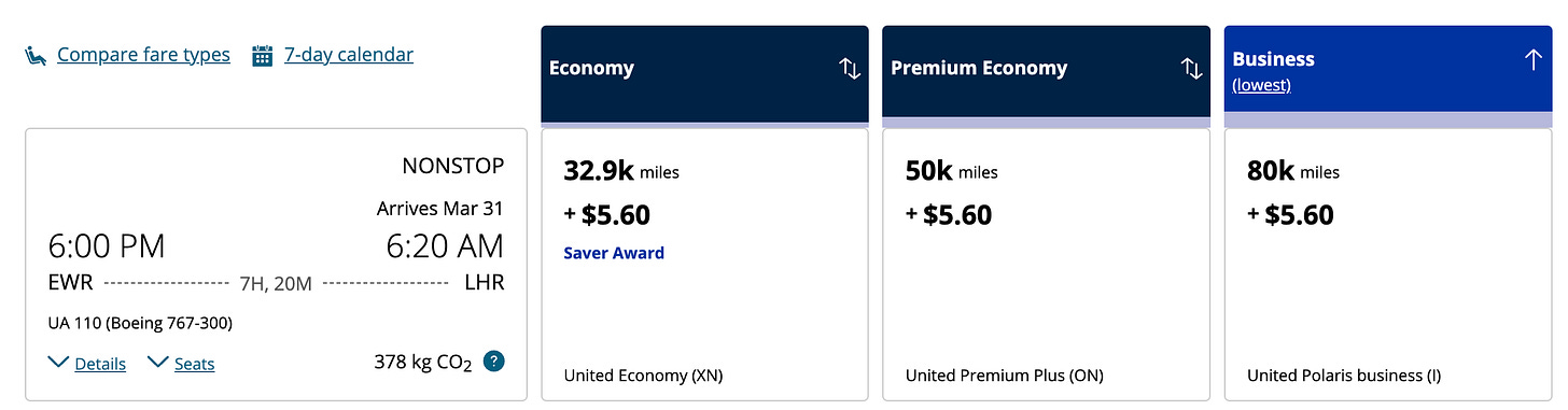 Now for some examples! Let’s say you want to take advantage of the shoulder season for London in April — it’s starting to warm up but you’re not paying peak season prices. If you have a Chase Sapphire or Bilt card, you can transfer your credit card points to United MileagePlus and book a United Polaris business class flight departing March 30th from EWR to LHR for 80k miles.