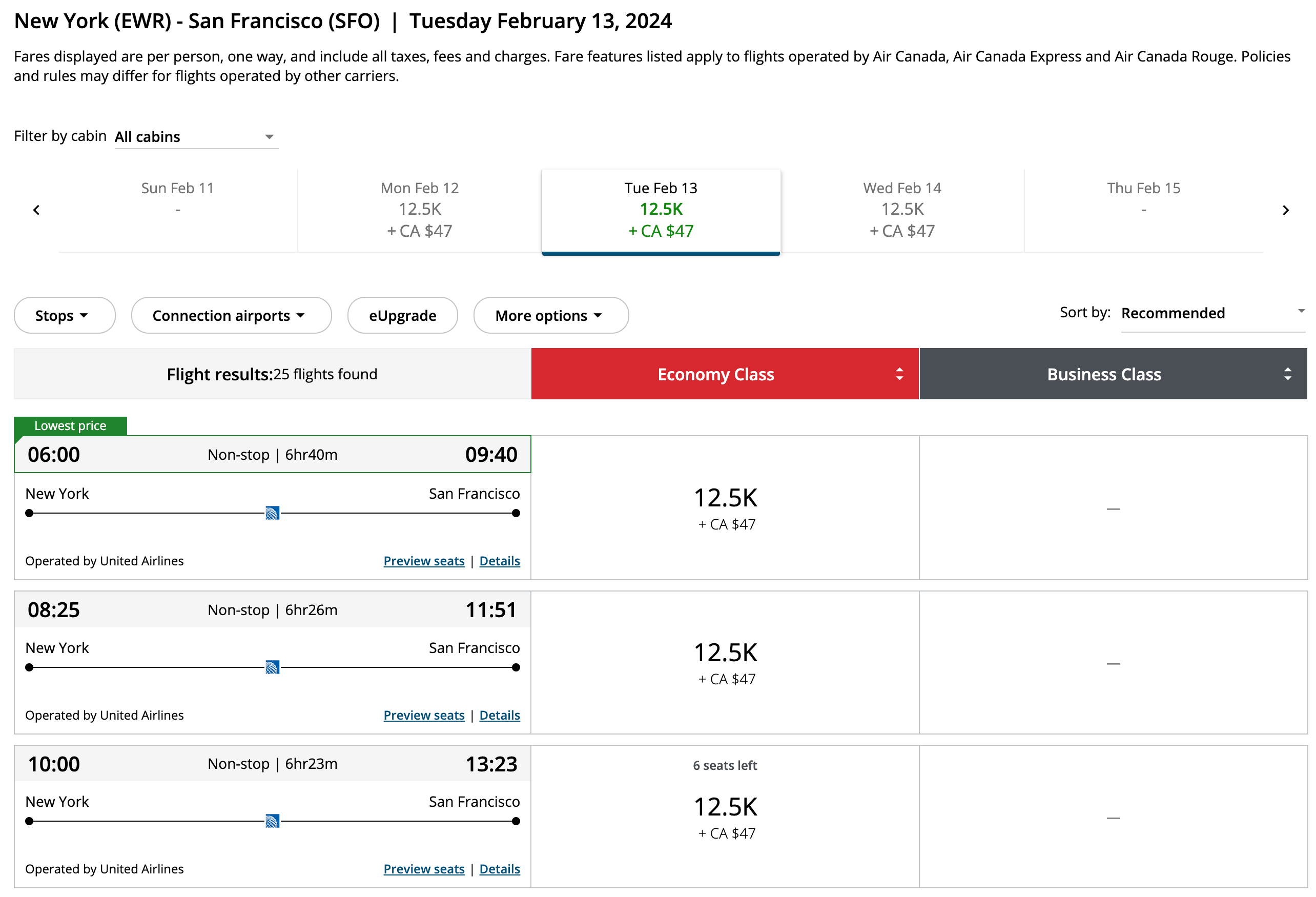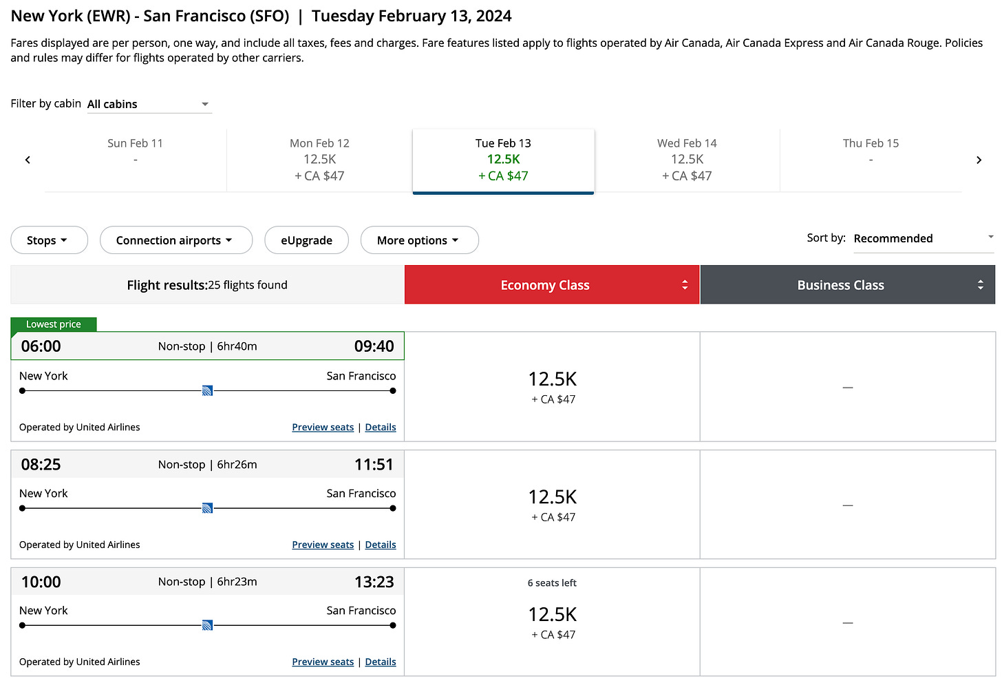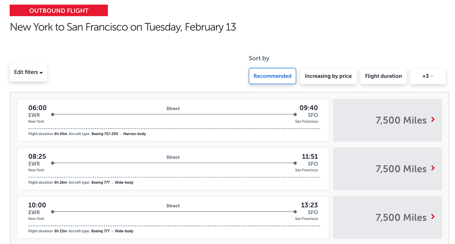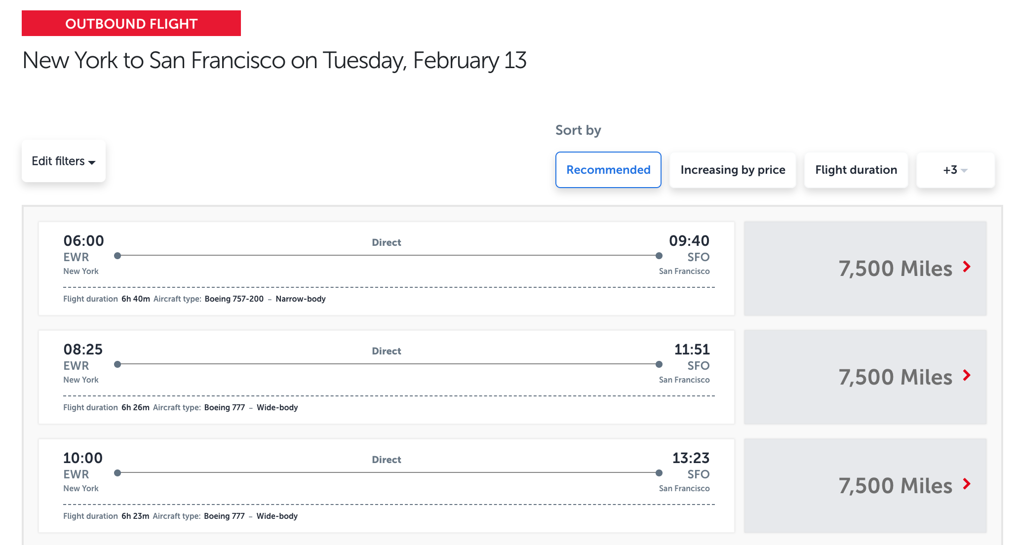 Let’s look for NYC > SFO for Feb 13 (perfect V-Day timing for all the cross-country long distance couples!).