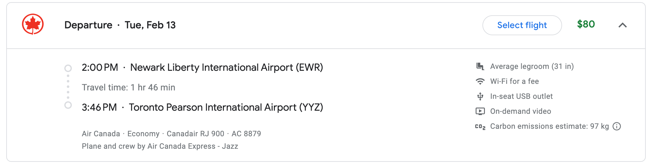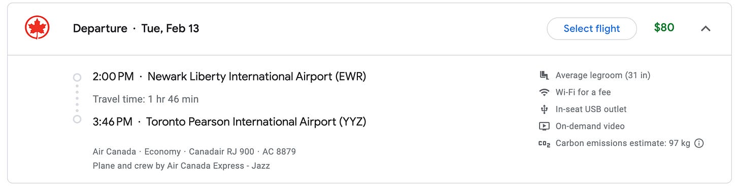 (Pro tip: You don’t have to reside in Toronto to take this flight…there’s dozens of NYC <> YYZ flights every day, and you could just book a cheap one like the one below, chill in the Air Canada lounge for free with your business class ticket, and hop over to Paris from there.)
