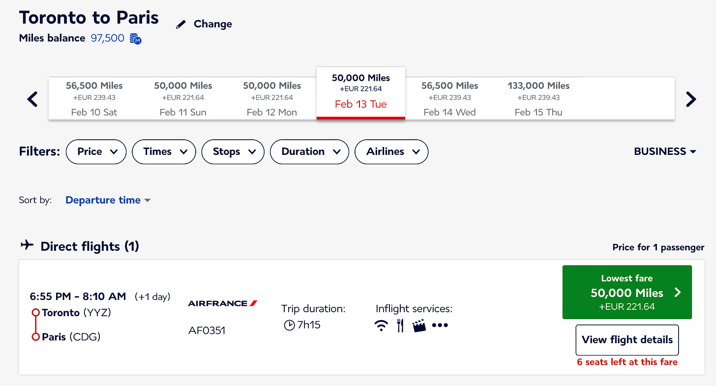 Let’s check out an example. Let’s say you’re looking to do V-Day in the city of love, Paris. We can pop in Toronto for the origin and Paris for the destination, and select Business. Seems there’s some partner saver space for Feb 13! You can tell because the button is in green; non-saver space is shown in blue.